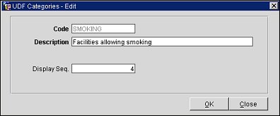 Access the UDF Categories screen by selecting Configuration>Property>Property UDF>UDF Categories. The Property UDF functionality is available in PMS regardless of whether the ORS (OPR<version number>ORS) license code is active, or whether the OPP_MHOT OPERA Property Management Multi-Property Base add-on license code or the OPP_MHT2 Multi-Property Cross Reservation add-on license code is active.