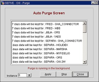The purpose of the Auto Purge Screen is a quick reference of configured interfaces and the amount of days that the messages in the OXI_HUB message status tables will be kept before being purged permanently. The activation of the purge data is only required once and should be set to Start on the day your central system goes live.