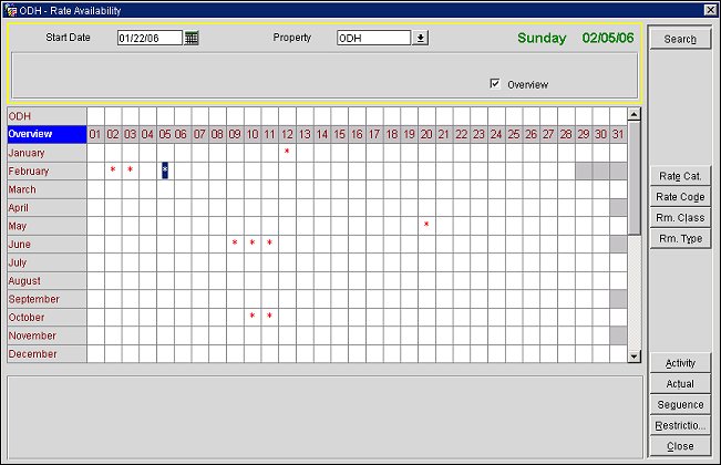 Overview. Select this check box to view rate availability by month and day for a 12-month period, starting with the month in the Start Date field. (You can scroll down beyond the current 12-month period to see availability for any month and date in the future.) The Overview shows dates having any kind of restriction indicated by an asterisk. (When you select this option, the Rate Category/Rate Code, Room Class/Room Type, and Year View search criteria are unavailable.)