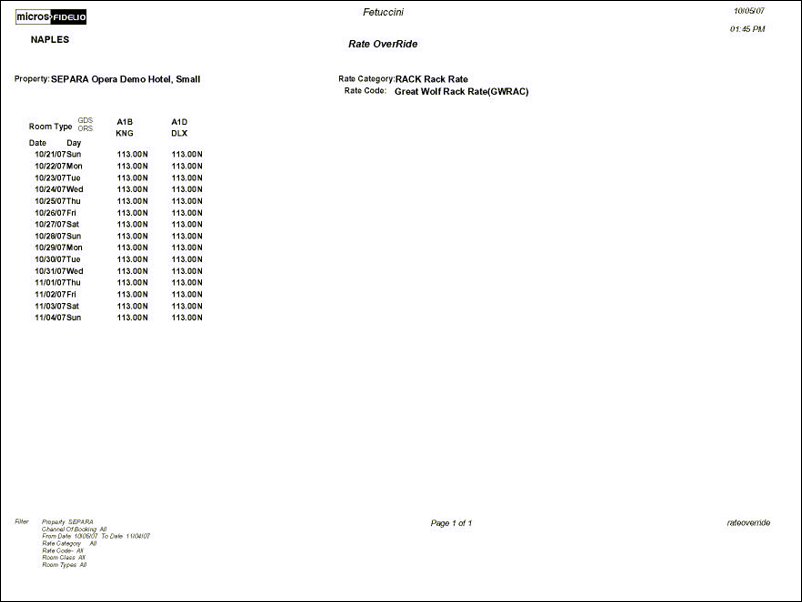 This report identifies the daily rates configured for properties. You can filter the daily rates by property, channel, revenue date range, and other room parameters. The Y (Yes) or N (No) next to the daily rate on the report indicates if it has a rate rule associated with it.