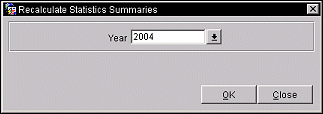The Recalculate Summary Statistics Utility, Utilities>Synchronize Utilities>Recalculate Past Daily Statistics>Recalculate Summary Statistics, recalculates yearly statistics for the specified year.