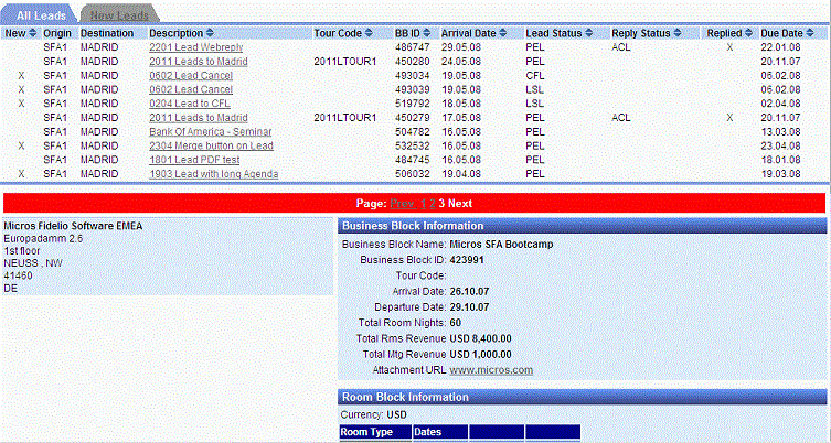 Room Block Information. Detailed room grid for the business block if this has been created on the SFA system. If no room grid is attached to the booking, this section will not appear. Note the ability to update the rates directly from the Web Lead Reply screen in the Room Block Information section. If any changes are made to the rates from here, they are updated and sent back to SFA.