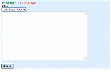 Submit. Select this button to send the lead reply information from the web page to the database. This action will update the lead automatically on the SFA system with the new reply status and reply notes, if any have been entered.