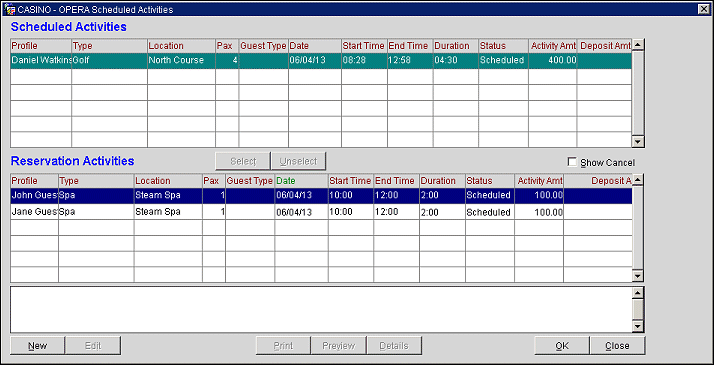 The screen consists of two grids. The lower grid (titled Reservation Activities) shows those activities that are associated with the current reservation. The upper grid (titled Scheduled Activities) shows other scheduled activities attached to the profile for which the reservation has been made.