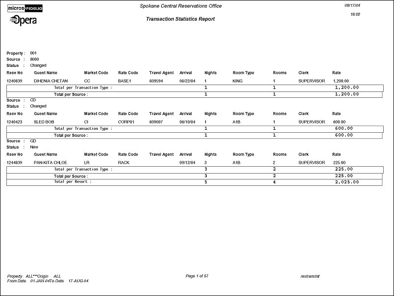 The Transaction Statistics Report displays reservations (Resv no, Guest Name, Market Code, Rate Code, Travel Agent, Arrival, Room Type, Clerk, Rooms, Nights and Rate amount) and totals for Nights, Rooms, Rate Amounts by Groups . You can filter the report by Property and Date range. The report groups by Property, Source and Status.