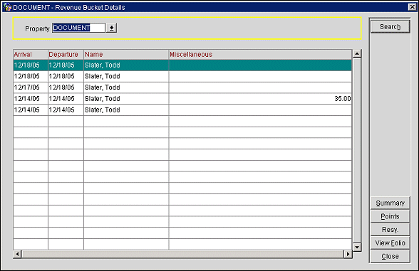 Note: If you access the Revenue Bucket Details screen from an account, group, or source profile, the screen shows revenue attributable to guests whose reservations were attached to the current account, group, or source.