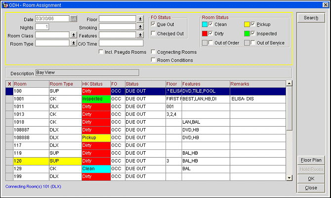 Highlight the reservation to assign a room on the Room Assignment screen and select the Assign button to display the Room Assignment List grid. Clean rooms are displayed by default. (Inspected rooms are displayed if the ROOMS MANAGEMENT > INSPECTED STATUS application function is set to Y). Use the check boxes to include rooms with other housekeeping statuses in the display.