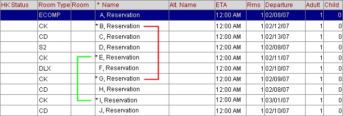 When the Room Assignment screen is first displayed, all of the reservations for that day are sorted in alphabetical order by the last name, first name of the guest associated to the reservation (as displayed below). In this example, B, Reservation is sharing with G, Reservation and E, Reservation is sharing with I, Reservation.