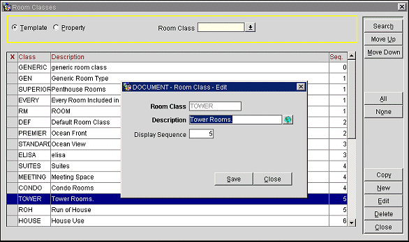 To copy room classes, select the Template option button to display the available template room classes. To choose the room classes to be copied, mark an X in the X column next to the room classes you want to duplicate. (You can also use the space bar to mark individual room classes or use the All/None buttons to mark and un-mark all room classes.) Then select the Copy button. The Property LOV appears. Choose the properties to copy the marked room classes to and select the OK button.