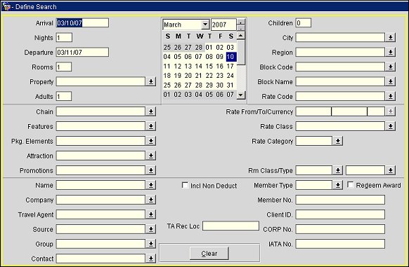 The information provided on the Define Search screen determines which properties meet the guest's requirements and from which you may review and select availability. You may enter as many or as few search criteria as you like; the more options you specify, the narrower your search becomes.