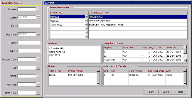 When the Sales screen is called from ORS, select the Profiles button on the Sales Screen to display the Profile screen. This screen allows you to see a complete picture of the profiles attached to the current reservation inquiry. The details available to you include negotiated rates and memberships which may be important in determining the guest rate. In addition, you can create new profiles.