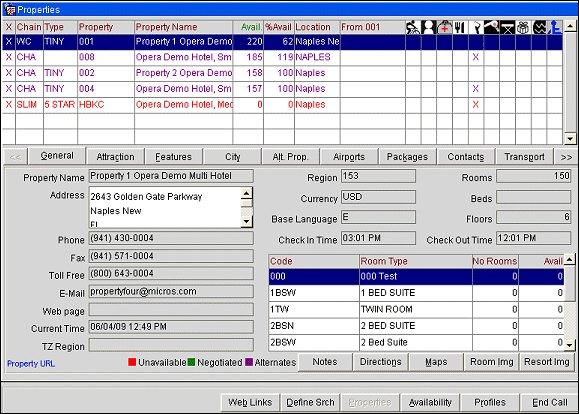 From the Properties screen, you may select the Availability button to go directly to choosing a rate. (When the OPR<version_number> ORS license is active, you may select the Profile button to go to the Profile screen. From the Profile screen you may attach profiles to this reservation inquiry and determine whether the associated profiles have negotiated rates or memberships that might affect the reservation.)