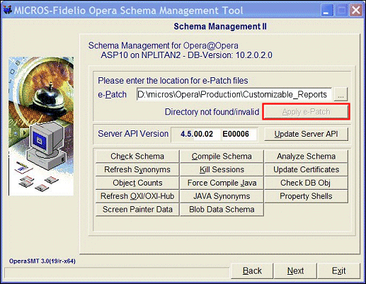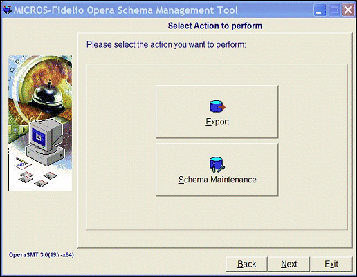 - Locate the OPERA_SMT.EXE in the tools directory of your OPERA installation, for example, \\Micros\opera\tools and start it. Click on Schema Maintenance.