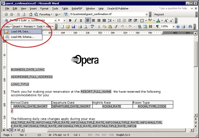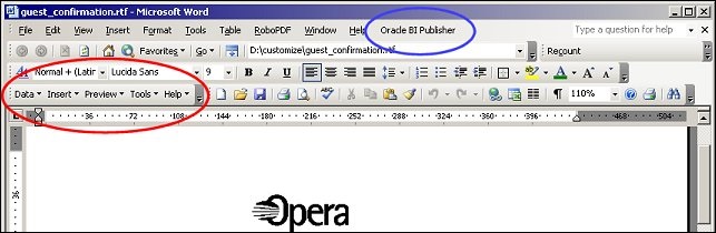 The Stationery Editor utilizes the technology of Oracle BI Publisher. The Reports stored data and the report display are separated (as opposed to using Oracle Report Builder). Microsoft Word will be used to customize layouts in RTF format, which will be converted into XSL-FO and then merged with XML data to generate final documents in PDF, HTML, or RTF format within OPERA.