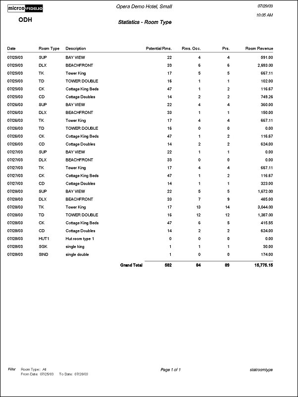 The Room Type Statistics Report displays by room the amount of room revenue generated per Room Type, the Potential Rooms that are available for a date, and the number of rooms occupied in the Room Type for a specific date or a date range. Print this report for information that can be used to improve customer service, fine-tune marketing strategies, and analyze revenue sources.