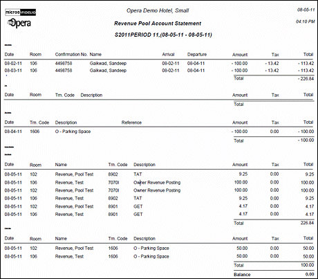In addition, the statement displays the name of the property, the date and time that the statement was produced, the date of the period, and the revenue pool account the statement was printed for. At the bottom-right hand corner of each statement is the total balance of the revenue pool.
