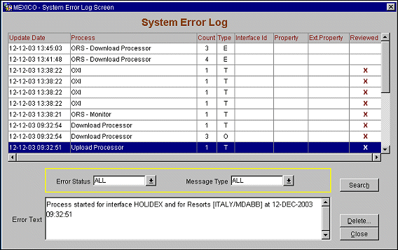 This screen is used to view summary entries from the OXI Processor Logs. The purpose is to display any internal system activity and errors or warnings that are not displayed on the “Message Status” screen. It will also contain records for every Start/Stop of the interface processors. Best utilized by IT Management or Reservations Management for resolution of system issues. Detailed information is provided in the OXI Processor Logs. See the topic later in this document of how to access those logs.