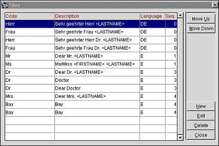 In the Title Suffix field, enter a suffix number that identifies the unique combination of Title Code, Description, and Language. Users cannot insert the same Title Code more than once without a Title Suffix. You can create as many descriptions and envelope greetings as necessary for the same Title Code and Language Code. Using German as an example, the user can create several Title Codes=Herr and Language Code=DE that can have envelope greetings. Each combination of Title Code and Description must have a unique Title Suffix number that identifies it, however. For example: