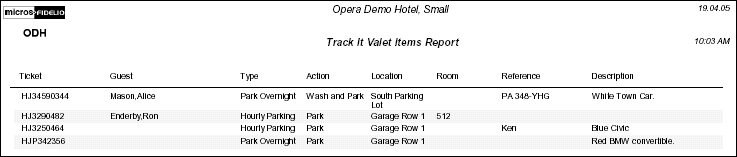 Select the Report button to prepare a copy of the search results grid entries that are currently displayed. If the ticket is attached to a reservation, the guest name and room are included in the report.