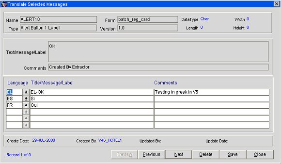 Provide the following information, then select Save to save your changes. If you marked multiple objects to translate on the Translation main screen using the X column, you can select Next and Previous to move among the objects you chose. (The Enter key can also be used to move to the next object to be translated.)