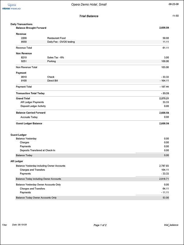 Reports to balance against: = Balance Yesterday (9a) + (Charges and Transfers (9b) + Payments(9c)) OR ar_ledger Closing Balance row OR araging Grand Total row for the Total column OR aragingdet Grand Total for the Total column The Balance Today including Owner Accounts is displayed when the OPV_<version number> Opera Vacation Ownership license is active and displays the Balance Today including Owner Account values. |